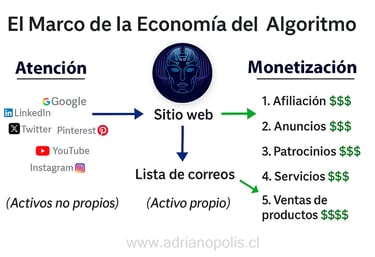 En la era de los algoritmos, la atención se ha convertido en la nueva moneda. Plataformas como Instagram, YouTube, Google o TikTok distribuyen visibilidad según sus propias reglas, que cambian constantemente. Puedes tener miles de seguidores, pero si el algoritmo decide que tu contenido no es relevante, desapareces del mapa. Aquí es donde entra en juego el Marco de la Economía del Algoritmo, un modelo que explica cómo transformar la atención prestada en redes sociales (activos no propio) en ingresos sostenibles y controlados desde un sitio web propio.