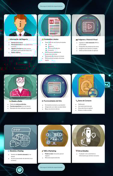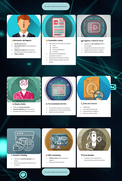 Allí encontrarás una guía clara que abarca desde la información del negocio y los textos del sitio, hasta los aspectos de diseño, funcionalidades, SEO y datos de contacto, para que puedas planificar de manera ordenada y efectiva cada etapa de tu web.